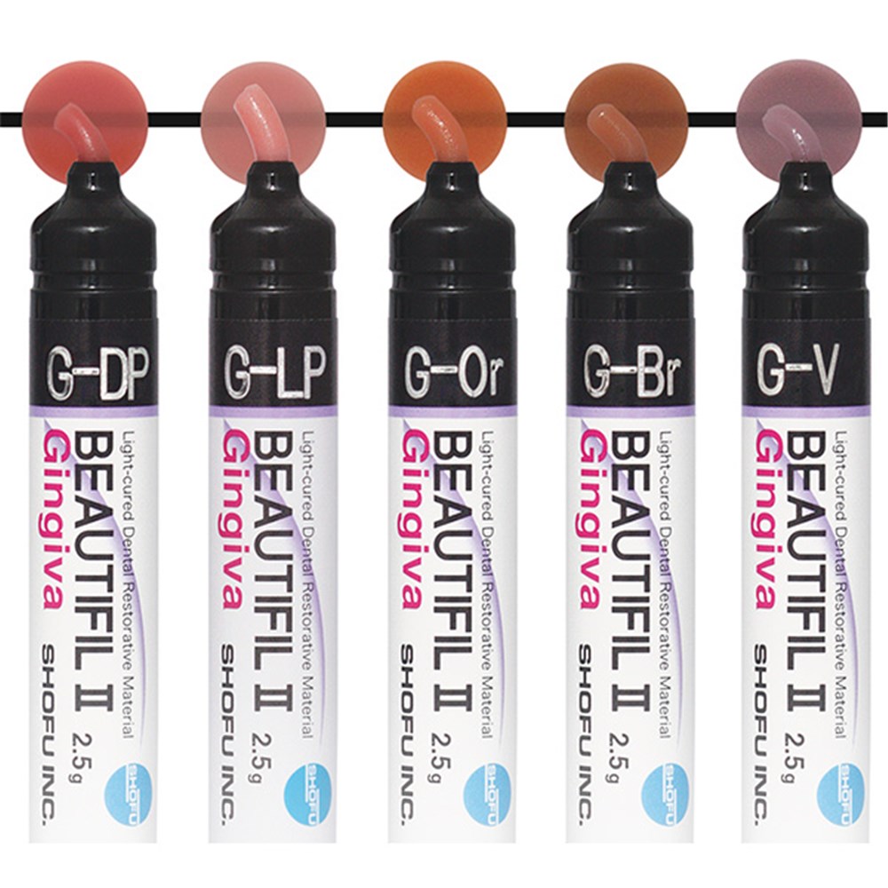 Beautifil II Gingiva Shades is a range of colors specifically designed to meet the aesthetic needs of the gingiva. These products utilize proprietary bioactive Giomer Technology and are primarily used in the cervical areas to correct gingival recession, wedge-shaped defects, and exposed cervical surfaces. The resin composites can be blended and layered to create custom shades tailored to the clinical needs of patients, providing aesthetic solutions without the need for surgery. The shades are designed to suit all ethnicities, making them ideal for restoring the natural beauty of the gums.